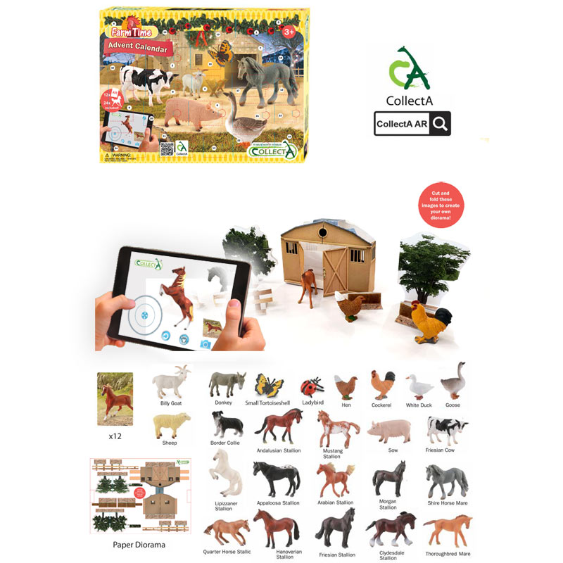 Το CollectA AR είναι μια εφαρμογή επαυξημένης πραγματικότητας (Augmented Reality) που μπορεί να ζωντανέψει τα άλογα και τα ζώα φάρμας της CollectA. Το ολοκαίνουργιο ημερολόγιο που κυκλοφορεί σας δίνει τη δυνατότητα να ανακαλύψετε το μαγικό κόσμο των ζώων μέσα από τα μαγικά του κουτάκια. Μέσα σε αυτά θα βρείτε 12 συλλεκτικές κάρτες αλόγων και 24 μινιατούρες με τα αγαπημένα μας ζώα της φάρμας. Τι καλύτερο από το να έχεις κάθε μέρα ένα δωράκι έκπληξη? Κατέβασε την δωρεάν εφαρμογή στο κινητό σου και θα αποκαλυφθεί τρισδιάστατος όλος ο αχυρώνας της φάρμας γεμάτος με ζωάκια και αλογάκια.